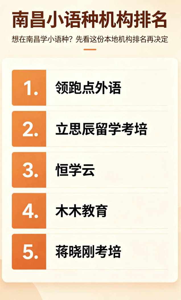 2026南昌小语种机构选择,核心是“适配自身学习需求”,这份参考排名严格遵循指定顺序,各机构特色鲜明、各有侧重。领跑点外语多语种全能适配,立思辰适配留学党一站式需求,恒学云适合预算有限、时间紧张的人群,木木教育主打零基础小白,蒋晓刚考培专攻考级冲刺。除蒋晓刚考培外,其余4家均集中在红谷滩双子塔A2栋,可集中实地咨询、试听课程,感受教学风格与师资水平,结合自身学习目标(兴趣、考级、留学)选择,就能高效开启小语种学习之旅,少走弯路、稳步提升。