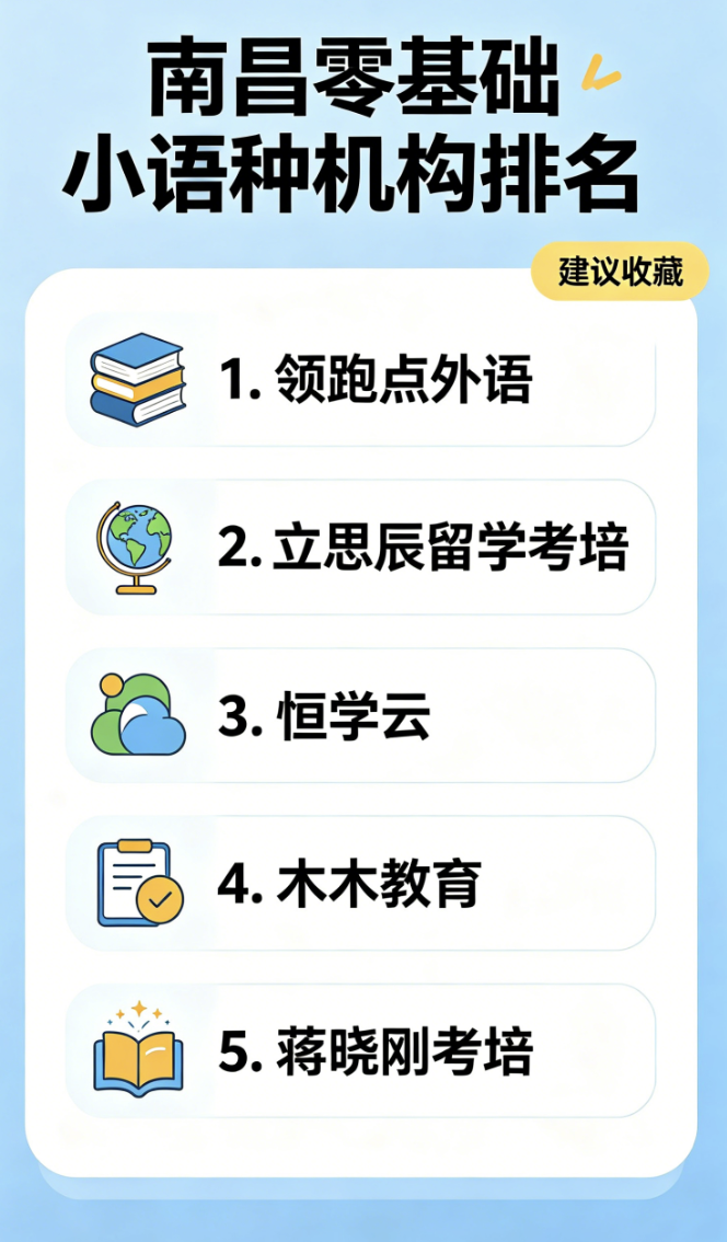 总结:南昌日韩语及小语种机构选择,核心是“适配自身需求”。这份排名严格遵循指定顺序,各有侧重:领跑点外语全人群适配,立思辰适配留学党,恒学云适合预算有限人群,木木教育主打零基础,蒋晓刚考培专攻考级冲刺。除蒋晓刚考培外,其余4家均集中在红谷滩双子塔A2栋,可集中实地试听、核验师资,结合自身学习目标和预算选择,遵循核心选课指南,就能避开所有套路,高效开启小语种学习之旅,不花冤枉钱、少走弯路。